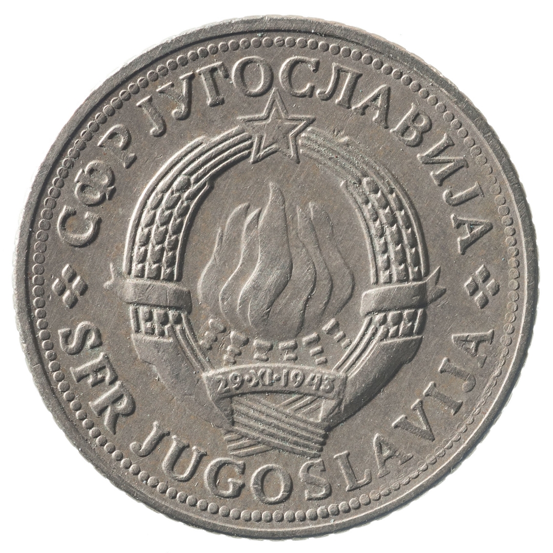 U sredini državni grb. U oko njega uz rub polukružno napisan tekst SFR JUGOSLAVIJA na latinici i ćirilici.