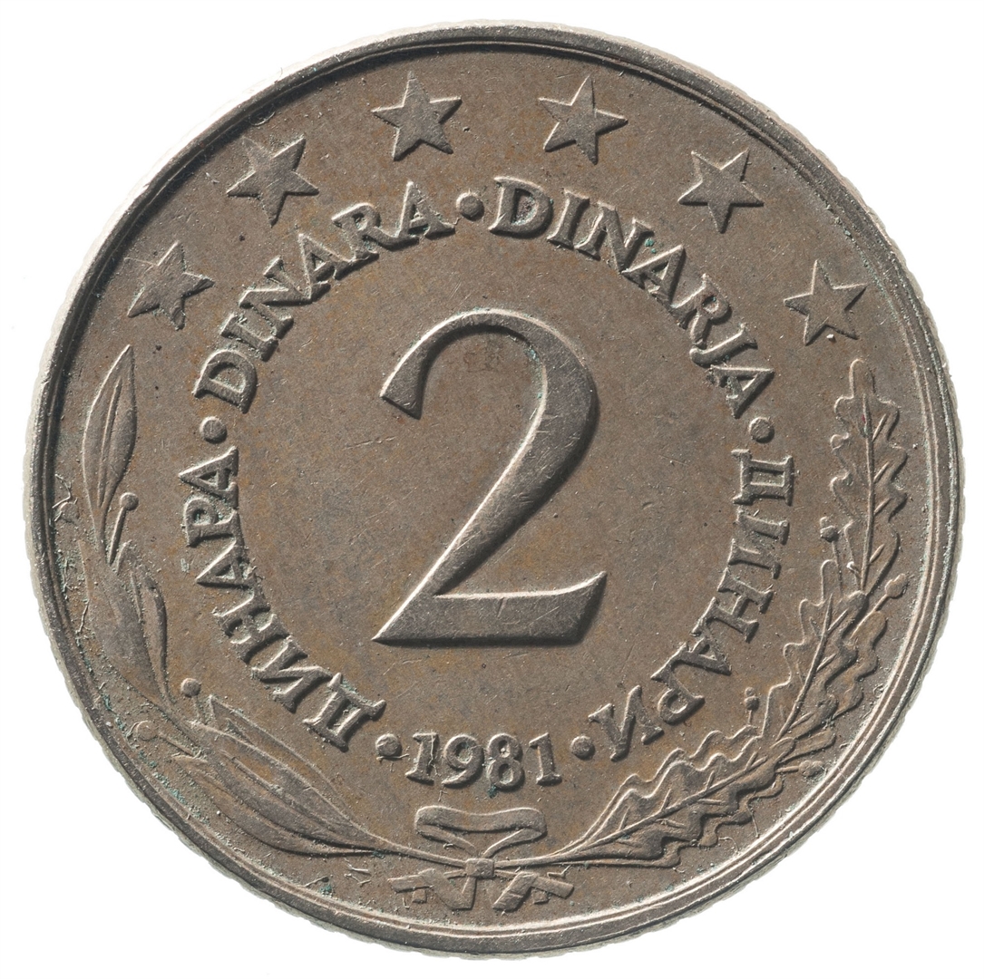 U sredini broj 2 (nominala), oko njega tekst DINAR na četiri jezika, a ispod toga godina 1972. Duž gornjeg ruba polukružno poredano 6 petokrakih zvjezdi.