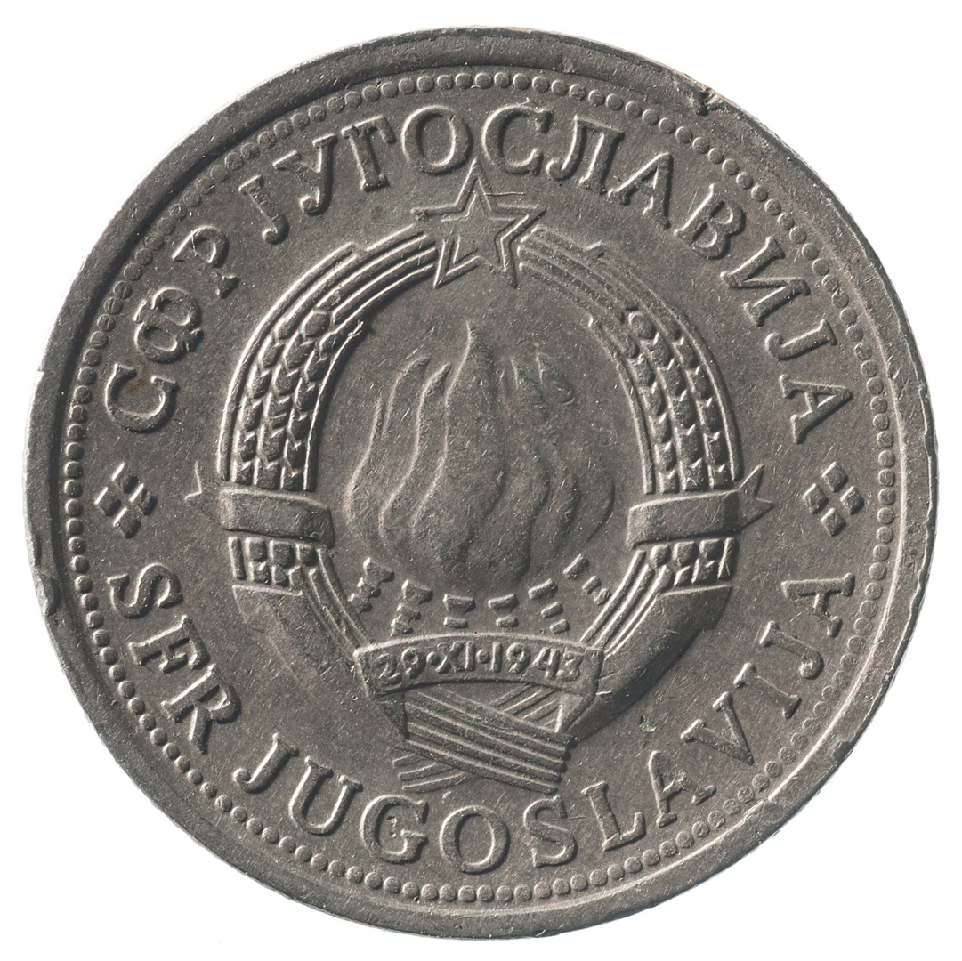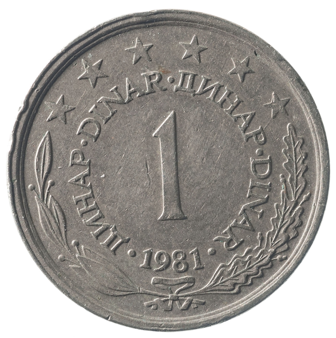 U sredini broj 1 (nominala), oko njega tekst DINAR na četiri jezika, a ispod toga godina 1981. Duž gornjeg ruba polukružno poredano 6 petokrakih zvjezdi.