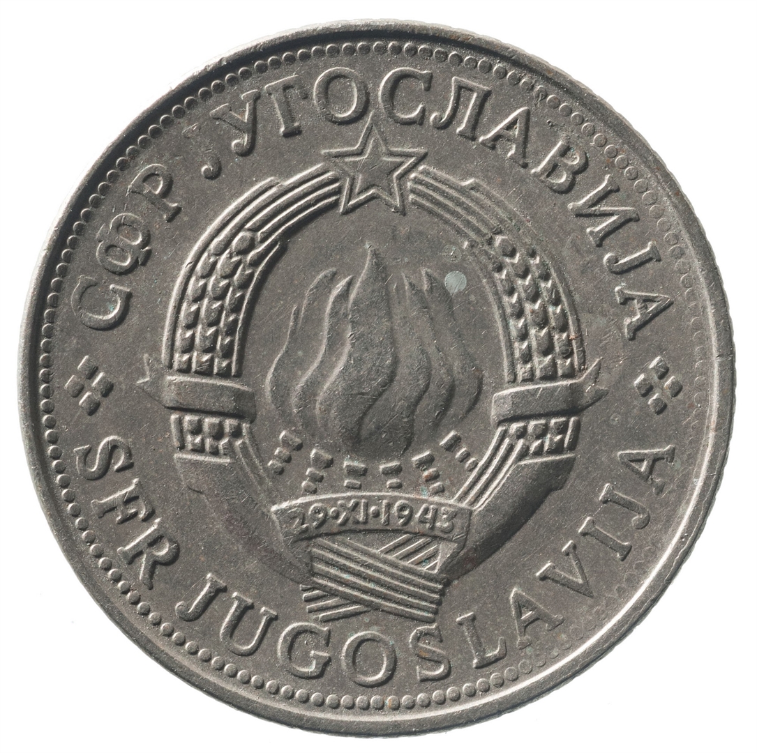 U sredini državni grb. U oko njega uz rub polukružno napisan tekst SFR JUGOSLAVIJA na latinici i ćirilici.