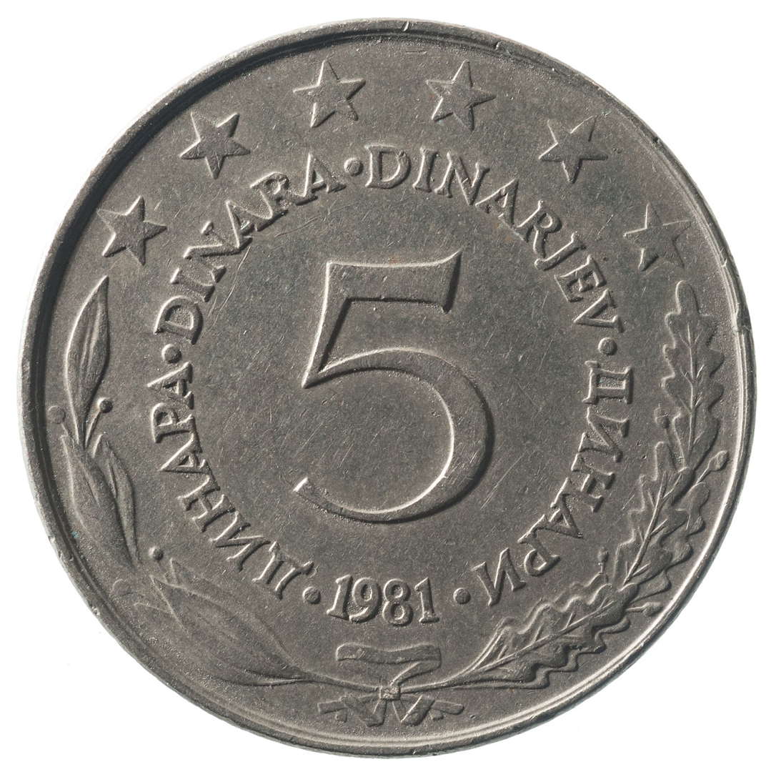 U sredini broj 5 (nominala), oko njega tekst DINAR na četiri jezika, a ispod toga godina 1981. Duž gornjeg ruba polukružno poredano 6 petokrakih zvjezdi.
