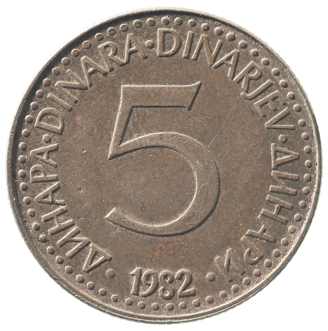 U sredini broj 5 (nominala), oko njega tekst DINAR na četiri jezika, a ispod toga godina 1982.