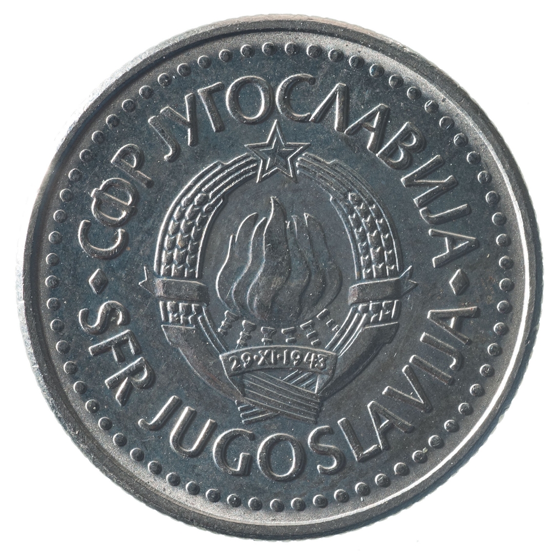 U sredini državni grb. Oko njega uz rub polukružno napisan tekst SFR JUGOSLAVIJA na latinici i ćirilici.