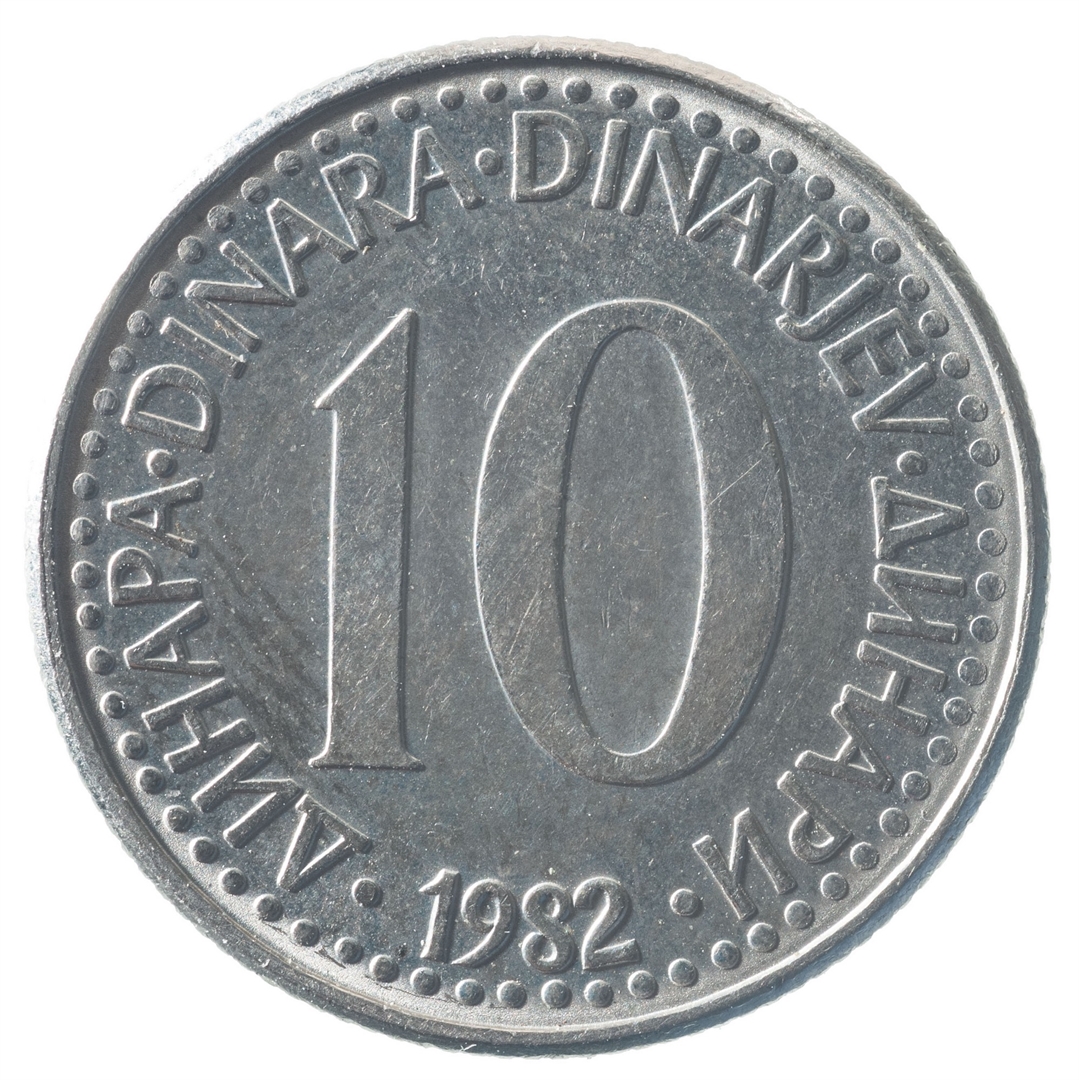 U sredini broj 10 (nominala), oko njega tekst DINAR na četiri jezika, a ispod toga godina 1982.
