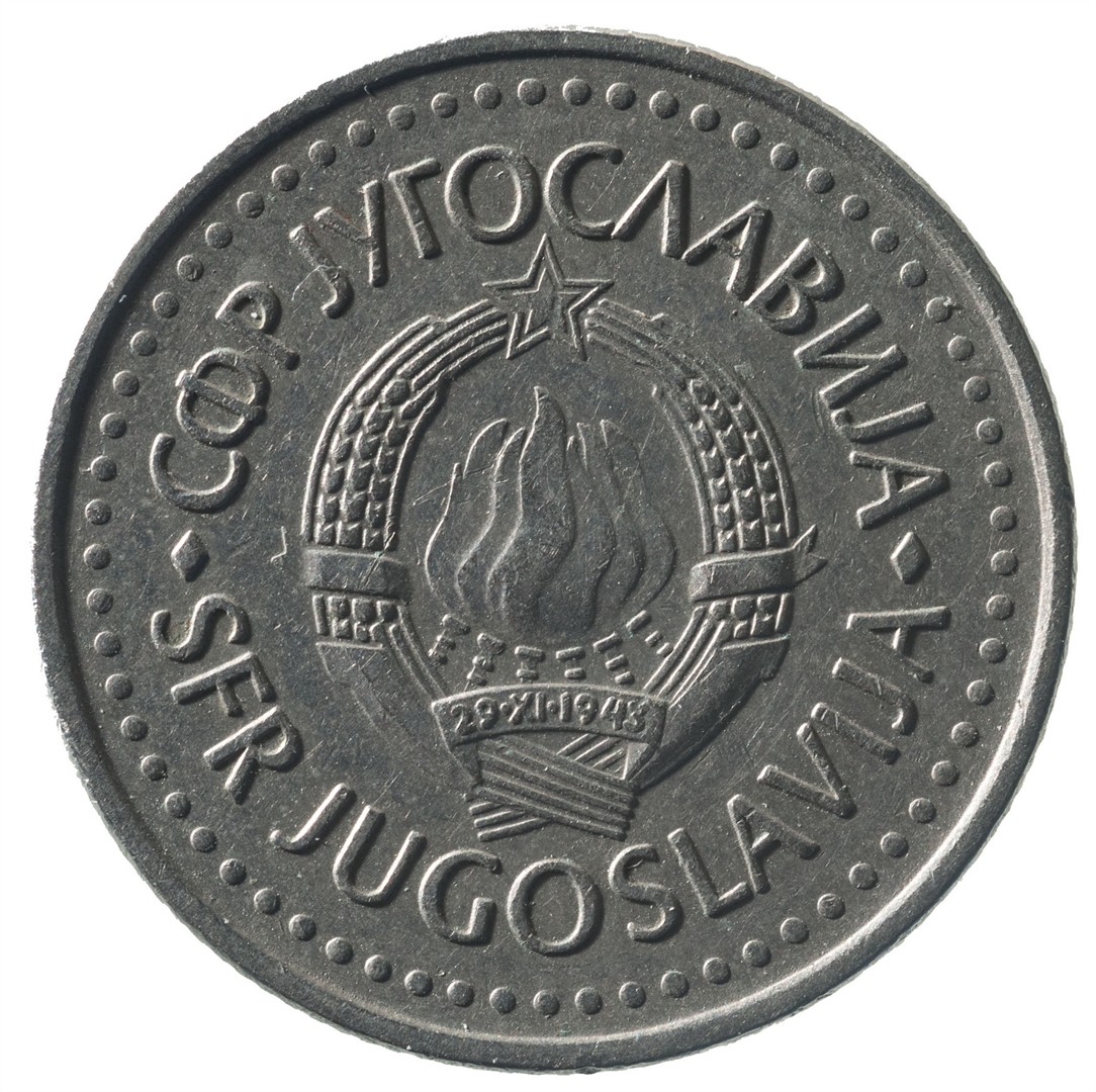 U sredini državni grb. Oko njega uz rub polukružno napisan tekst SFR JUGOSLAVIJA na latinici i ćirilici.