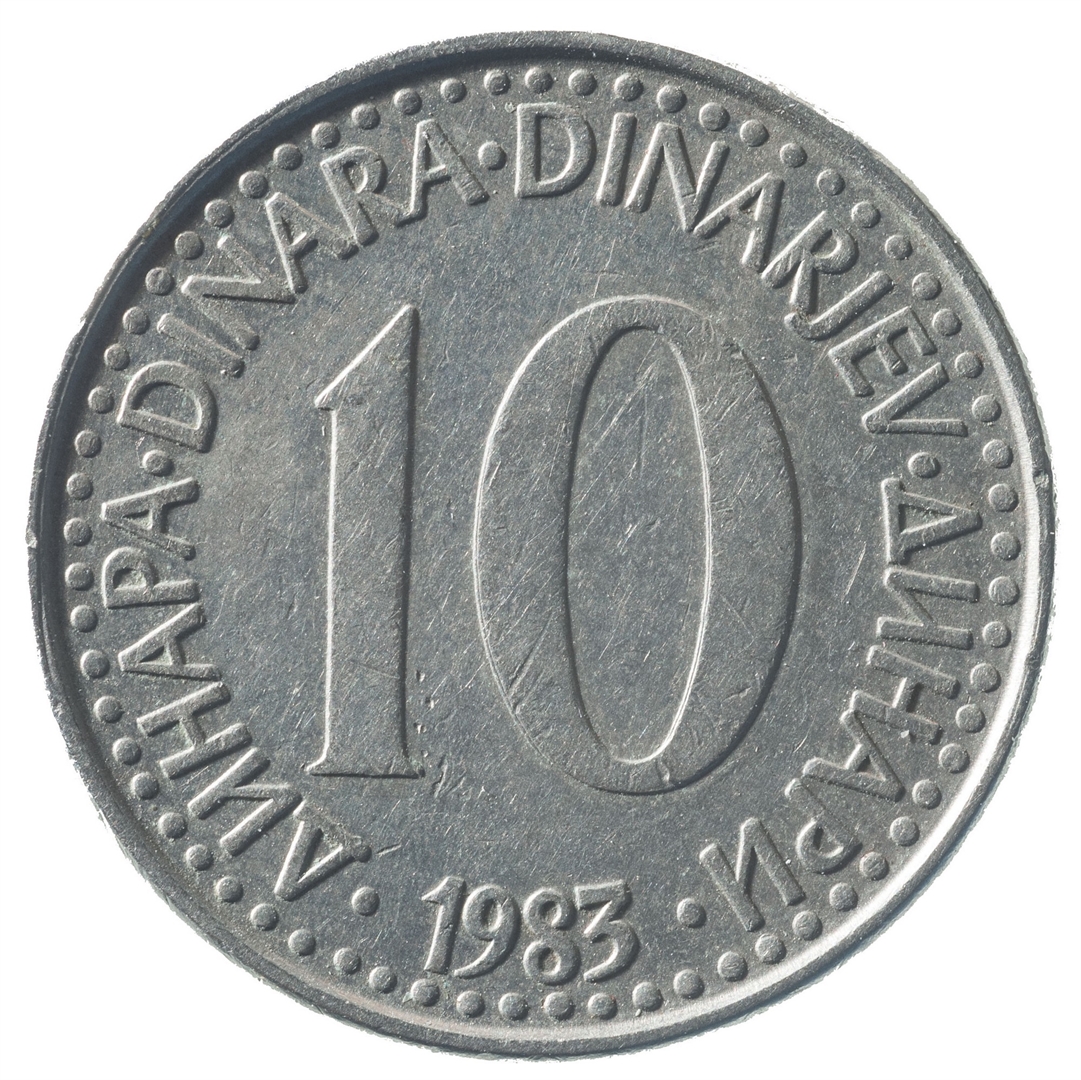U sredini broj 10 (nominala), oko njega tekst DINAR na četiri jezika, a ispod toga godina 1983.