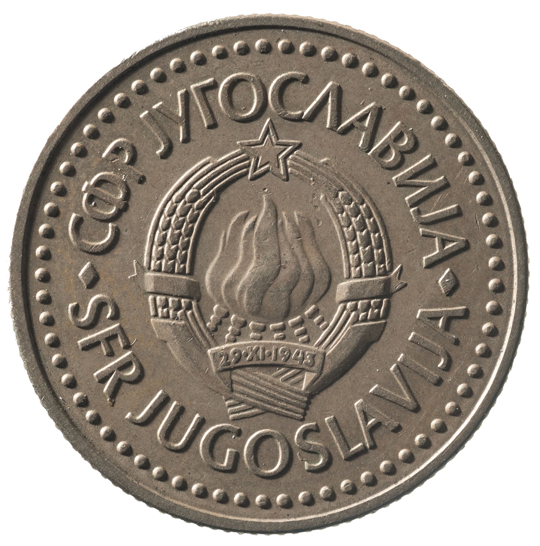 U sredini državni grb. Oko njega uz rub polukružno napisan tekst SFR JUGOSLAVIJA na latinici i ćirilici.