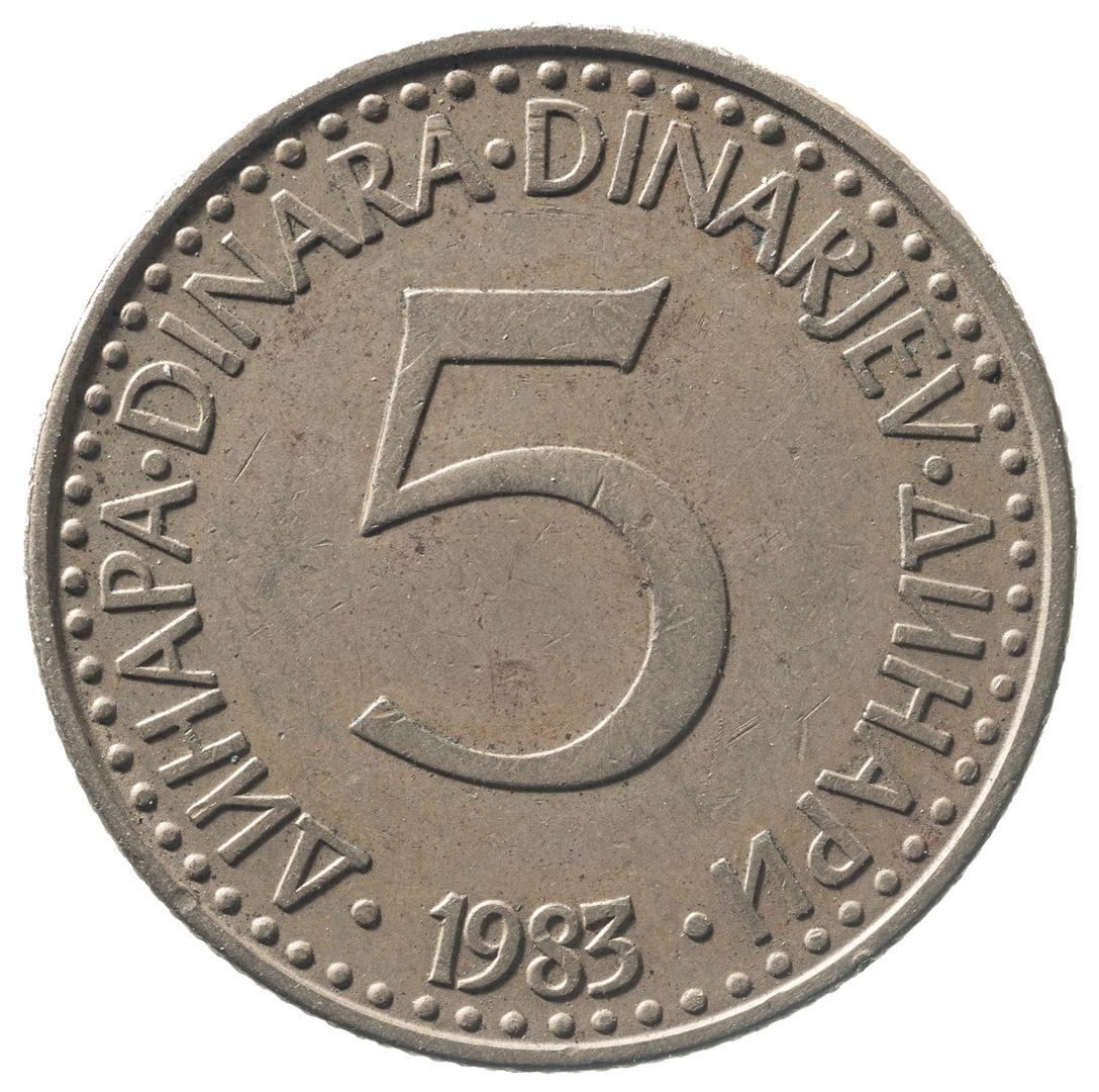 U sredini broj 5 (nominala), oko njega tekst DINAR na četiri jezika, a ispod toga godina 1983.
