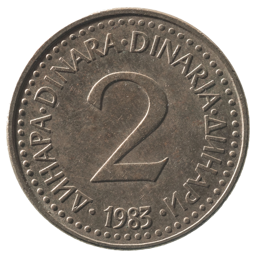 U sredini broj 2 (nominala), oko njega tekst DINAR na četiri jezika, a ispod toga godina 1983.