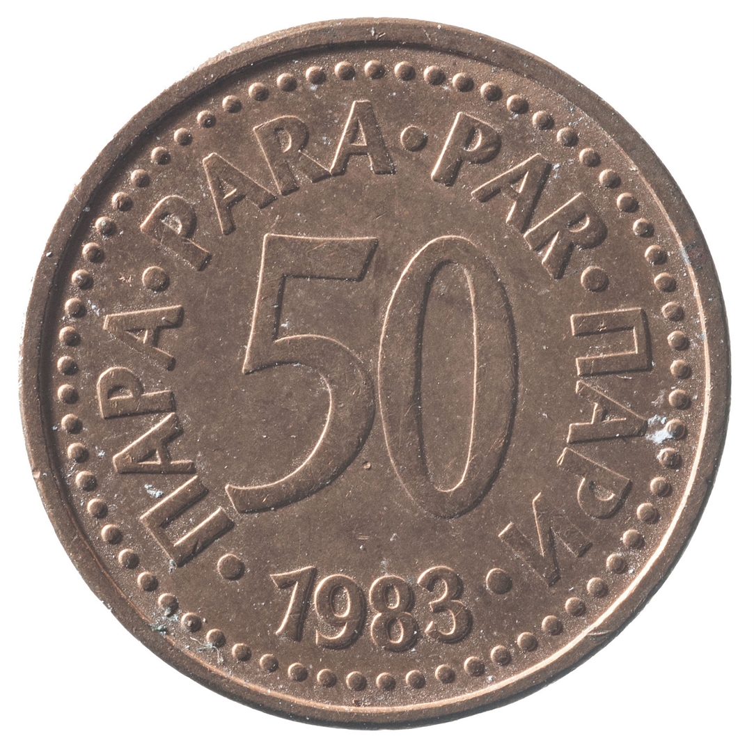 U sredini broj 50 (nominala), oko njega tekst PARA na četiri jezika, a ispod toga godina 1983.