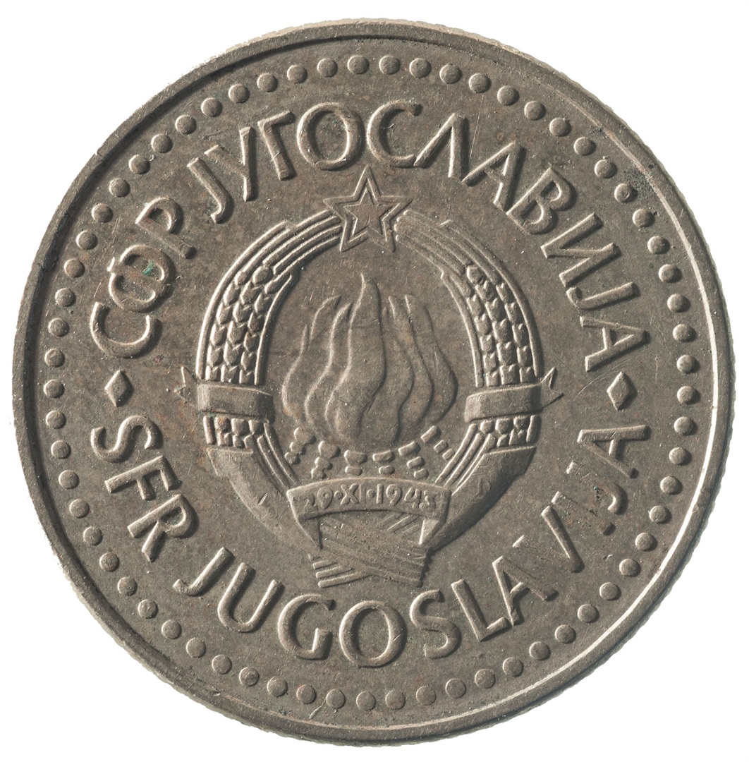 U sredini državni grb. Oko njega uz rub polukružno napisan tekst SFR JUGOSLAVIJA na latinici i ćirilici.