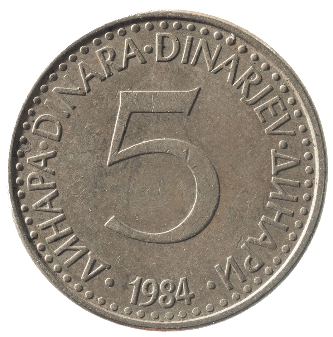 U sredini broj 5 (nominala), oko njega tekst DINAR na četiri jezika, a ispod toga godina 1984.