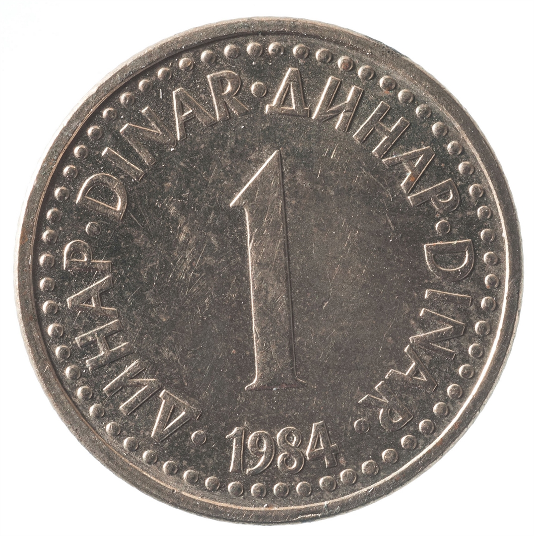 U sredini broj 1 (nominala), oko njega tekst DINAR na četiri jezika, a ispod toga godina 1984.