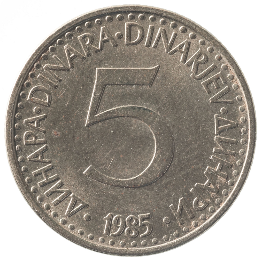U sredini broj 5 (nominala), oko njega tekst DINAR na četiri jezika, a ispod toga godina 1984.