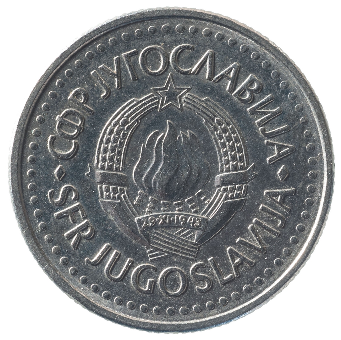 U sredini državni grb. Oko njega uz rub polukružno napisan tekst SFR JUGOSLAVIJA na latinici i ćirilici.