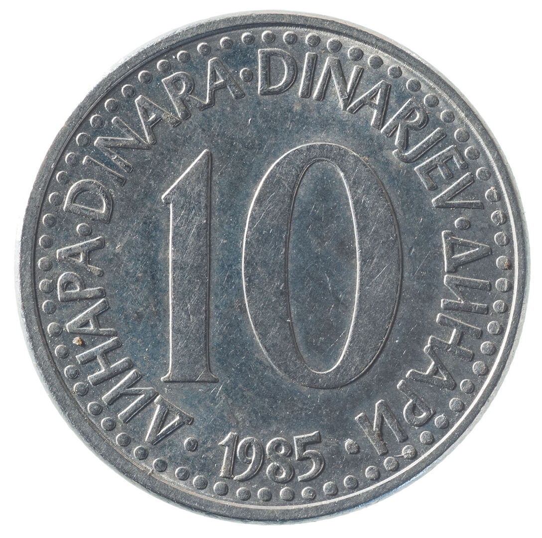 U sredini broj 10 (nominala), oko njega tekst DINAR na četiri jezika, a ispod toga godina 1985.