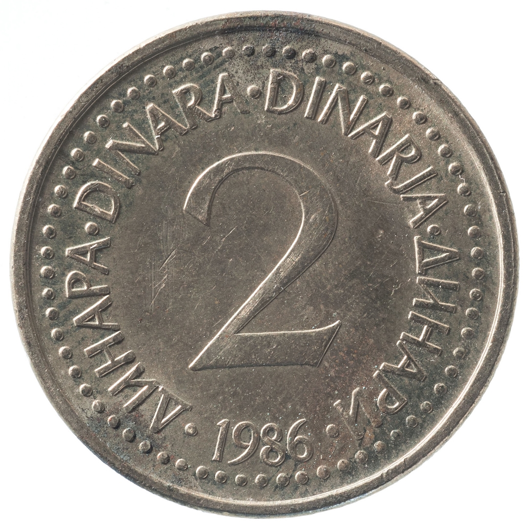 U sredini broj 2 (nominala), oko njega tekst DINAR na četiri jezika, a ispod toga godina 1986.