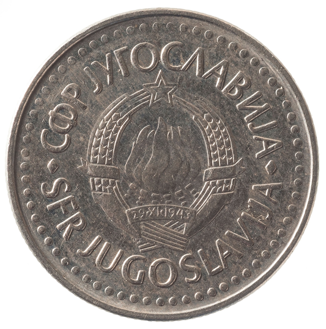U sredini državni grb. Oko njega uz rub polukružno napisan tekst SFR JUGOSLAVIJA na latinici i ćirilici.