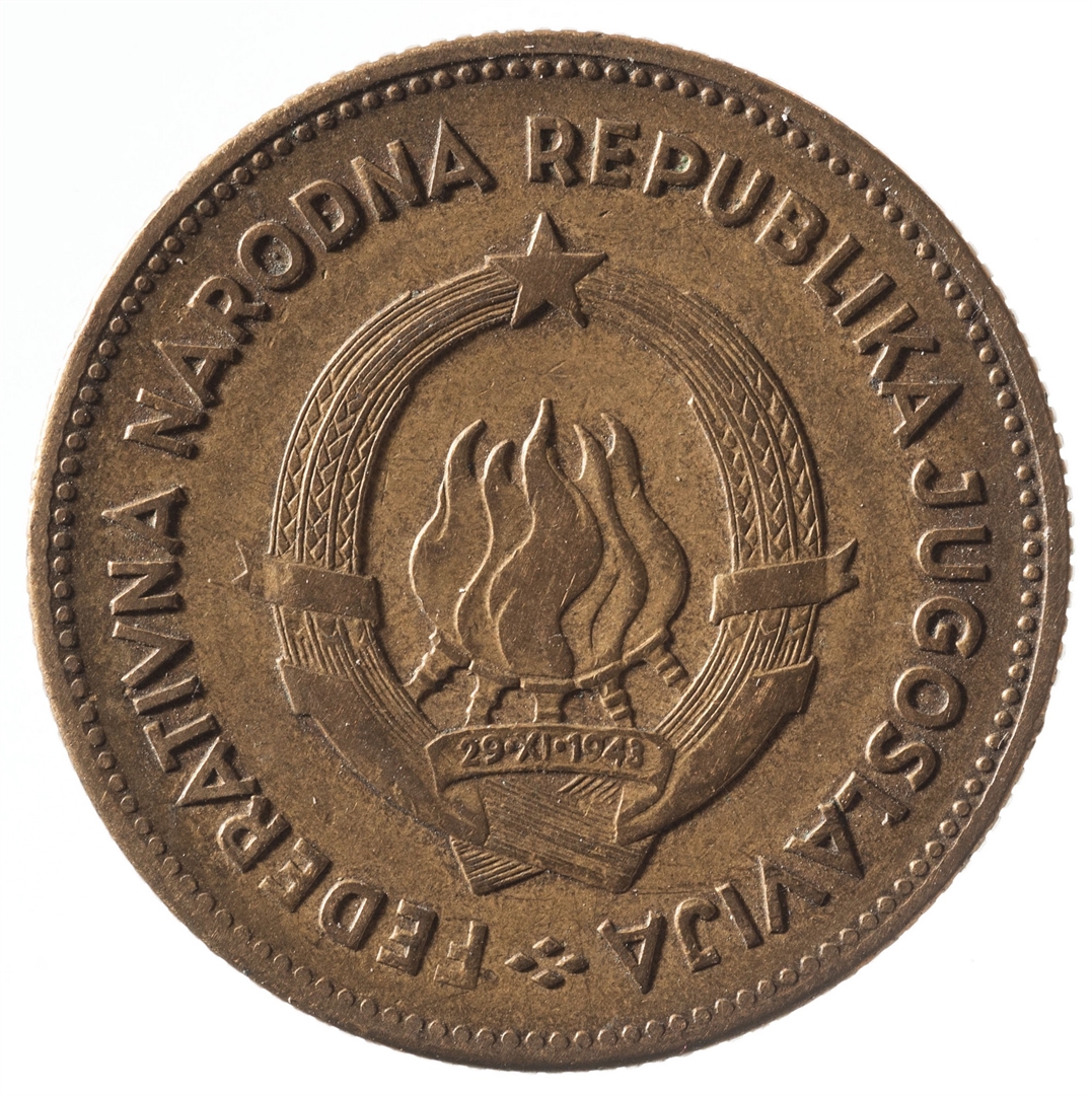 U sredini državni grb. U gornjem djelu uz rub polukružno napisan tekst FEDERATIVNA NARODNA REPUBLIKA JUGOSLAVIJA.
