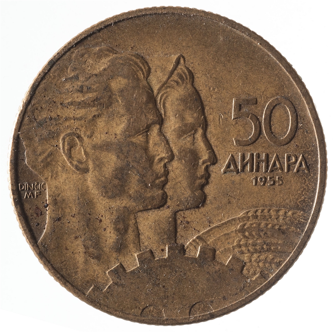 Prikaz seljanke koja drži žito i radnika uz stroj u profilu.Uz rub broj 50 (nominala), a ispod njega tekst DINARA na ćirilici i godina 1955.
