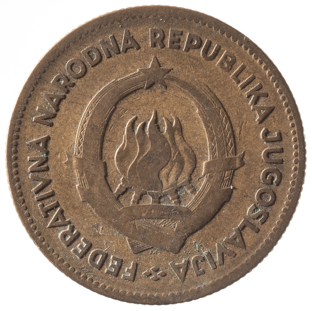 U sredini državni grb. U gornjem djelu uz rub polukružno napisan tekst FEDERATIVNA NARODNA REPUBLIKA JUGOSLAVIJA.