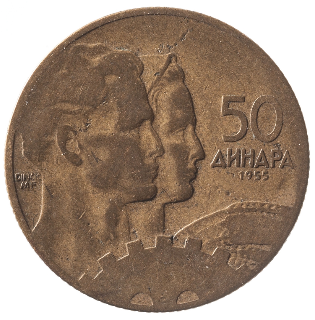 Prikaz seljanke koja drži žito i radnika uz stroj u profilu.Uz rub broj 50 (nominala), a ispod njega tekst DINARA na ćirilici i godina 1955.