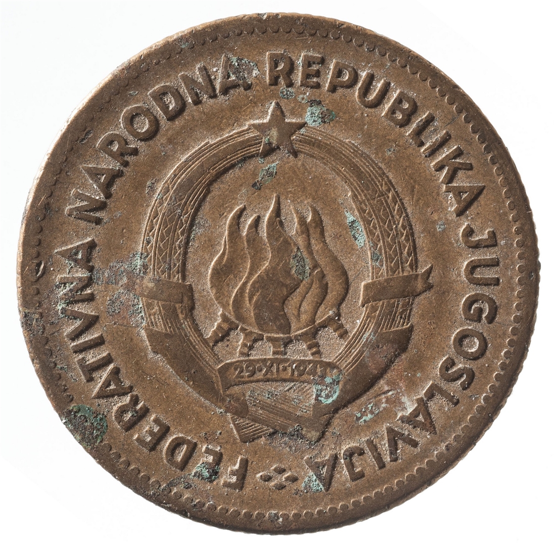 U sredini državni grb. U gornjem djelu uz rub polukružno napisan tekst FEDERATIVNA NARODNA REPUBLIKA JUGOSLAVIJA.