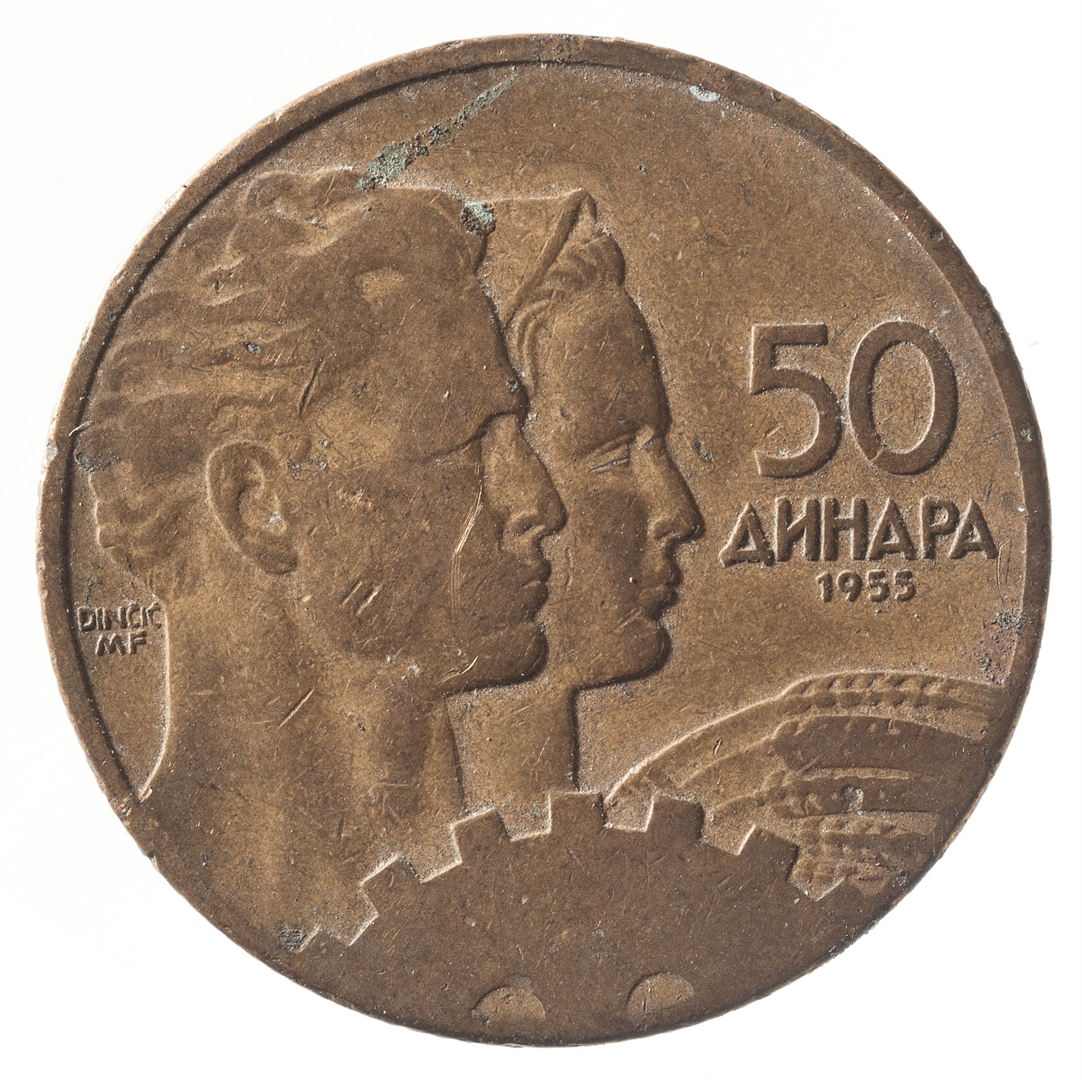 Prikaz seljanke koja drži žito i radnika uz stroj u profilu.Uz rub broj 50 (nominala), a ispod njega tekst DINARA na ćirilici i godina 1955.