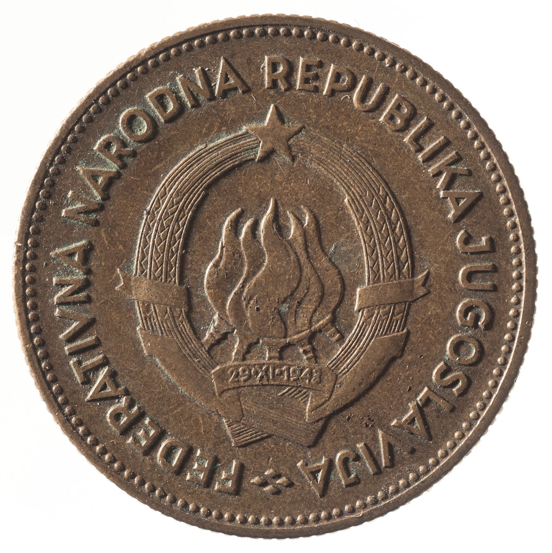 U sredini državni grb. U gornjem djelu uz rub polukružno napisan tekst FEDERATIVNA NARODNA REPUBLIKA JUGOSLAVIJA.