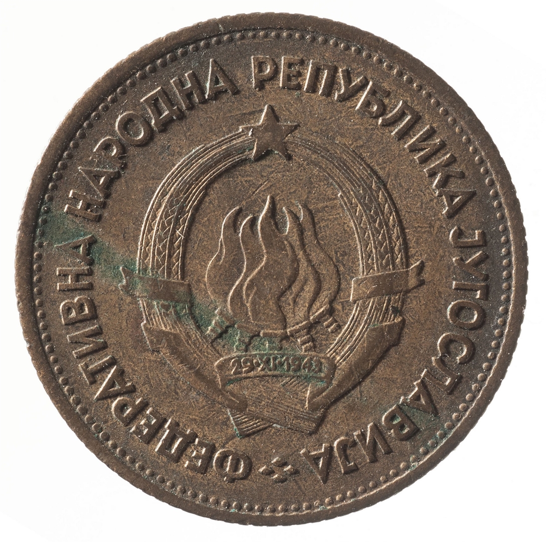 U sredini državni grb. U gornjem djelu uz rub polukružno napisan tekst FEDERATIVNA NARODNA REPUBLIKA JUGOSLAVIJA.