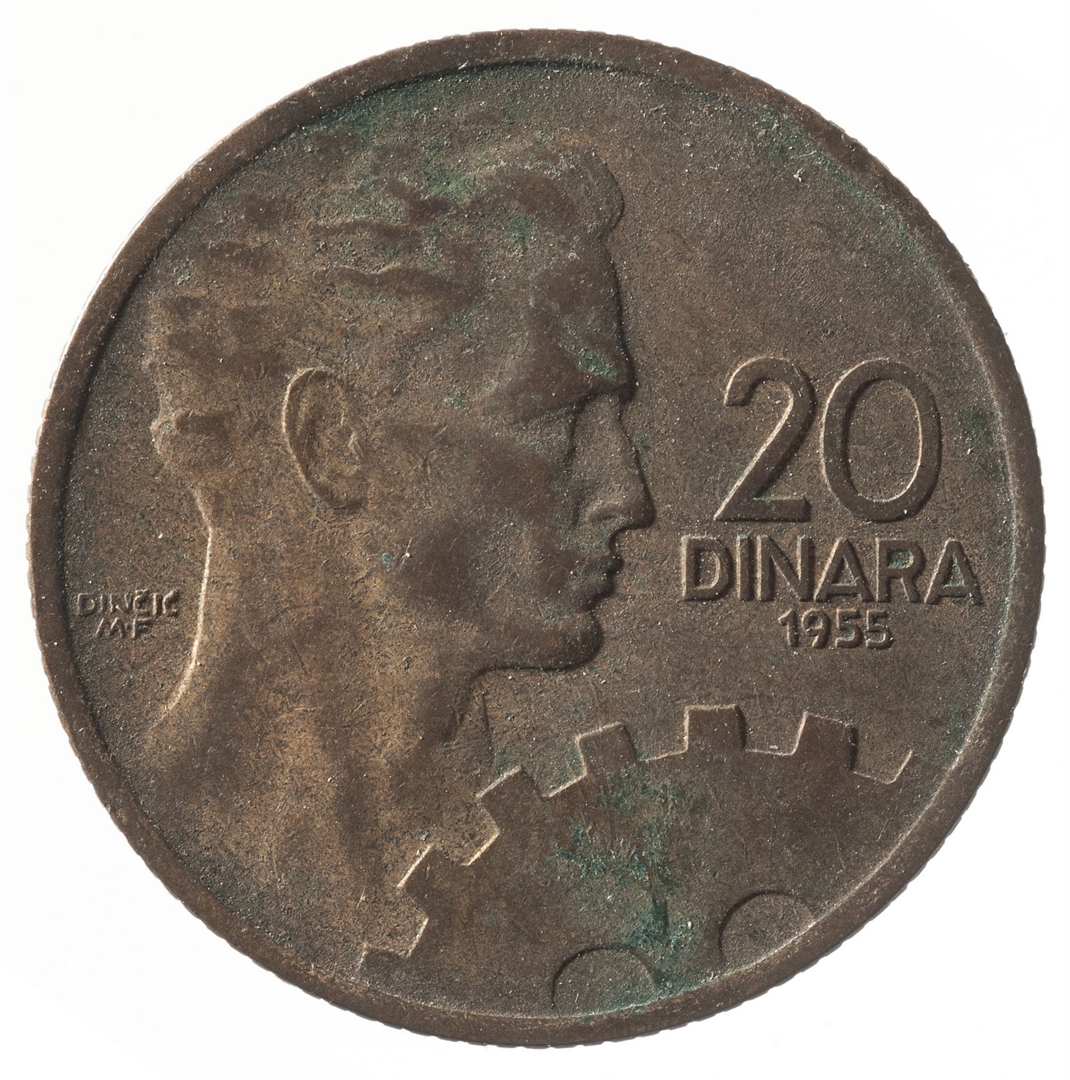 Prikaz radnika uz stroj u profilu.Uz rub broj 20 (nominala), a ispod njega tekst DINARA i godina 1955.