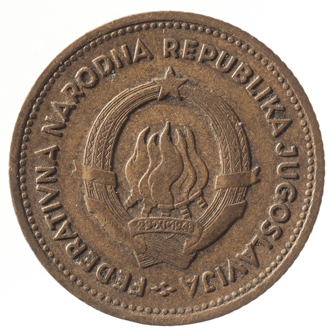 U sredini državni grb. U gornjem djelu uz rub polukružno napisan tekst FEDERATIVNA NARODNA REPUBLIKA JUGOSLAVIJA.