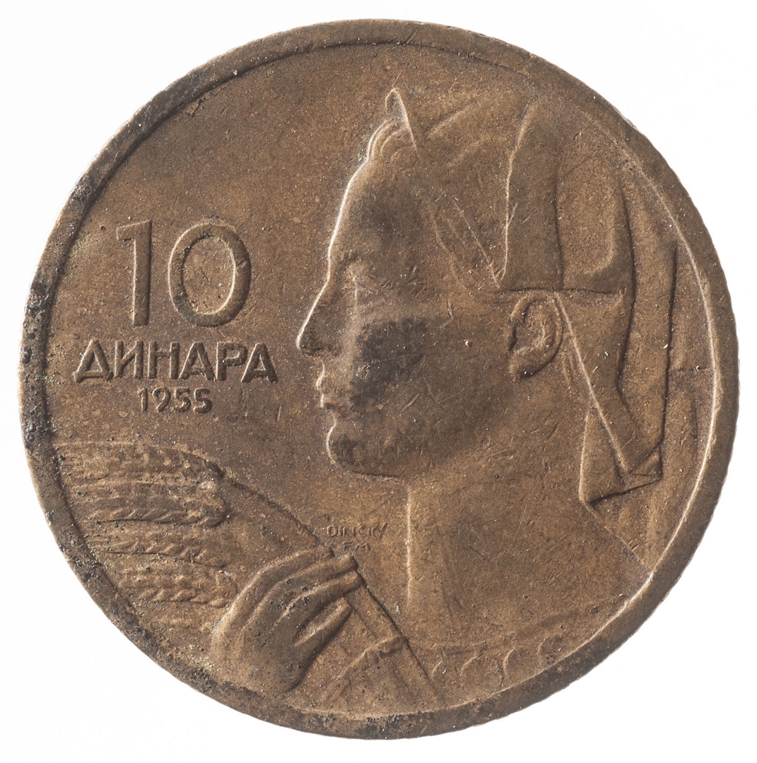Prikaz seljanke koja drži žito u profilu.Uz rub broj 10 (nominala), a ispod njega tekst DINARA na ćirilici i godina 1955.