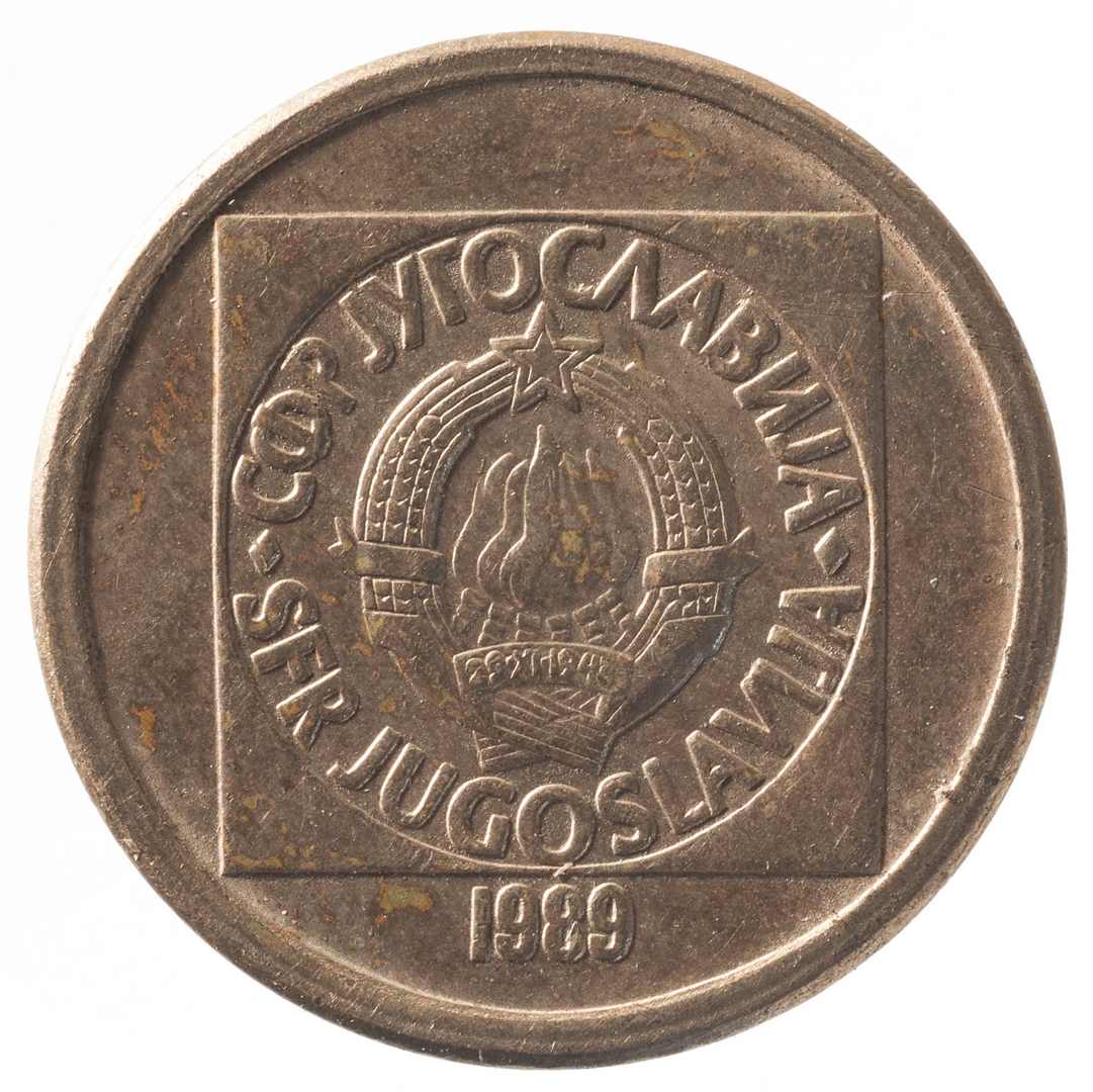 U sredini unutar četverokuta državni grb, a oko njega uz rub polukružno napisan tekst SFR JUGOSLAVIJA na latinici i ćirilici. Ispod godina 1989.
