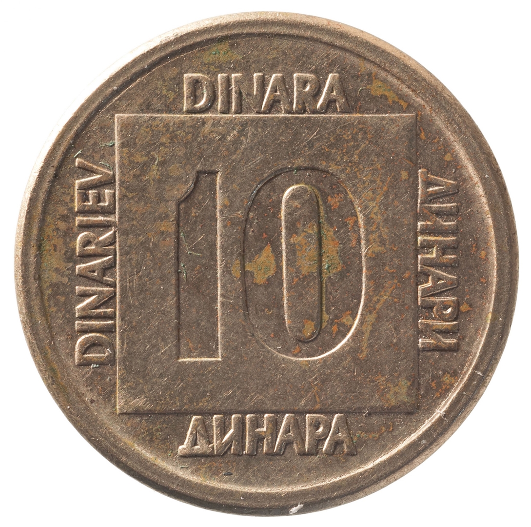 U sredini četverokuta broj 10 (nominala), oko njega tekst DINAR na četiri jezika.