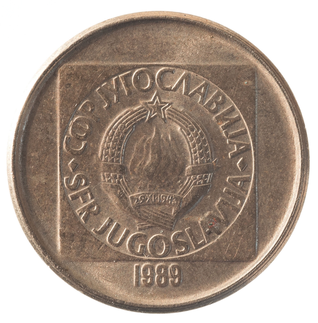 U sredini unutar četverokuta državni grb, a oko njega uz rub polukružno napisan tekst SFR JUGOSLAVIJA na latinici i ćirilici. Ispod godina 1989.