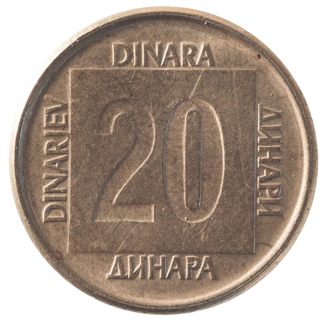 U sredini četverokuta broj 20 (nominala), oko njega tekst DINAR na četiri jezika.