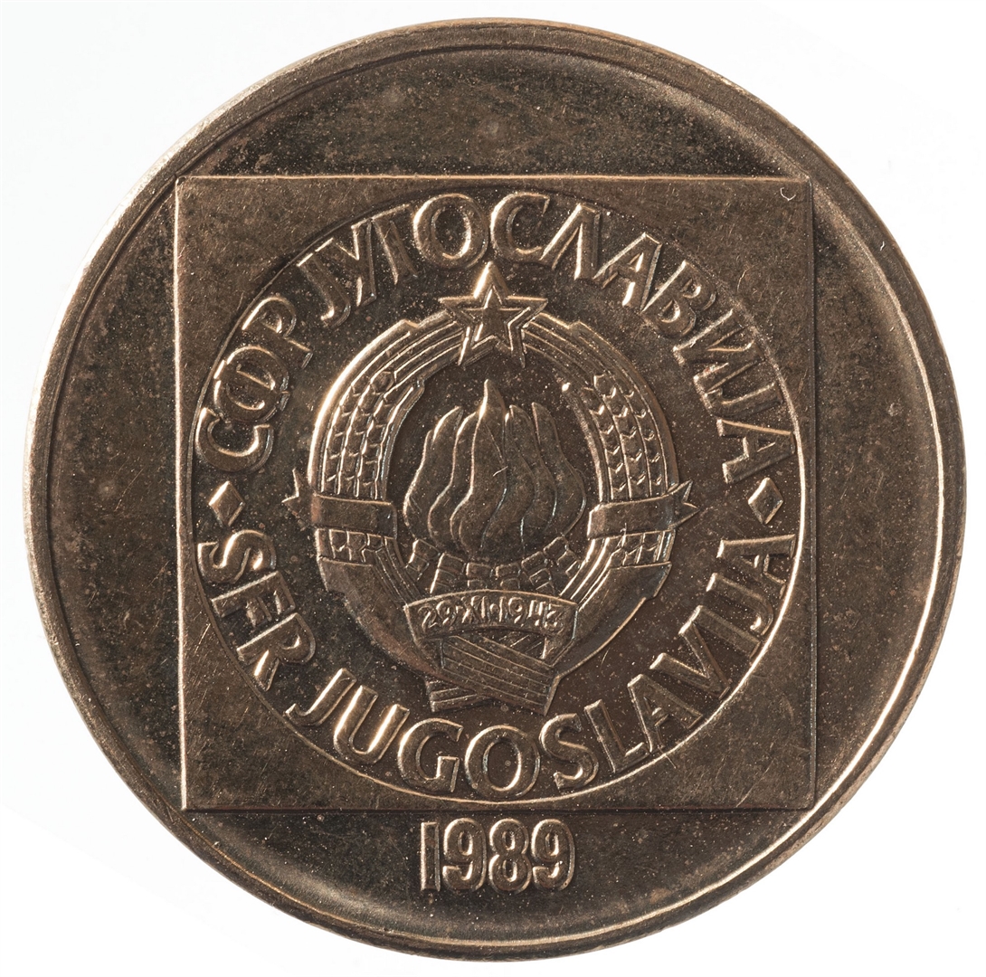 U sredini unutar četverokuta državni grb, a oko njega uz rub polukružno napisan tekst SFR JUGOSLAVIJA na latinici i ćirilici. Ispod godina 1989.
