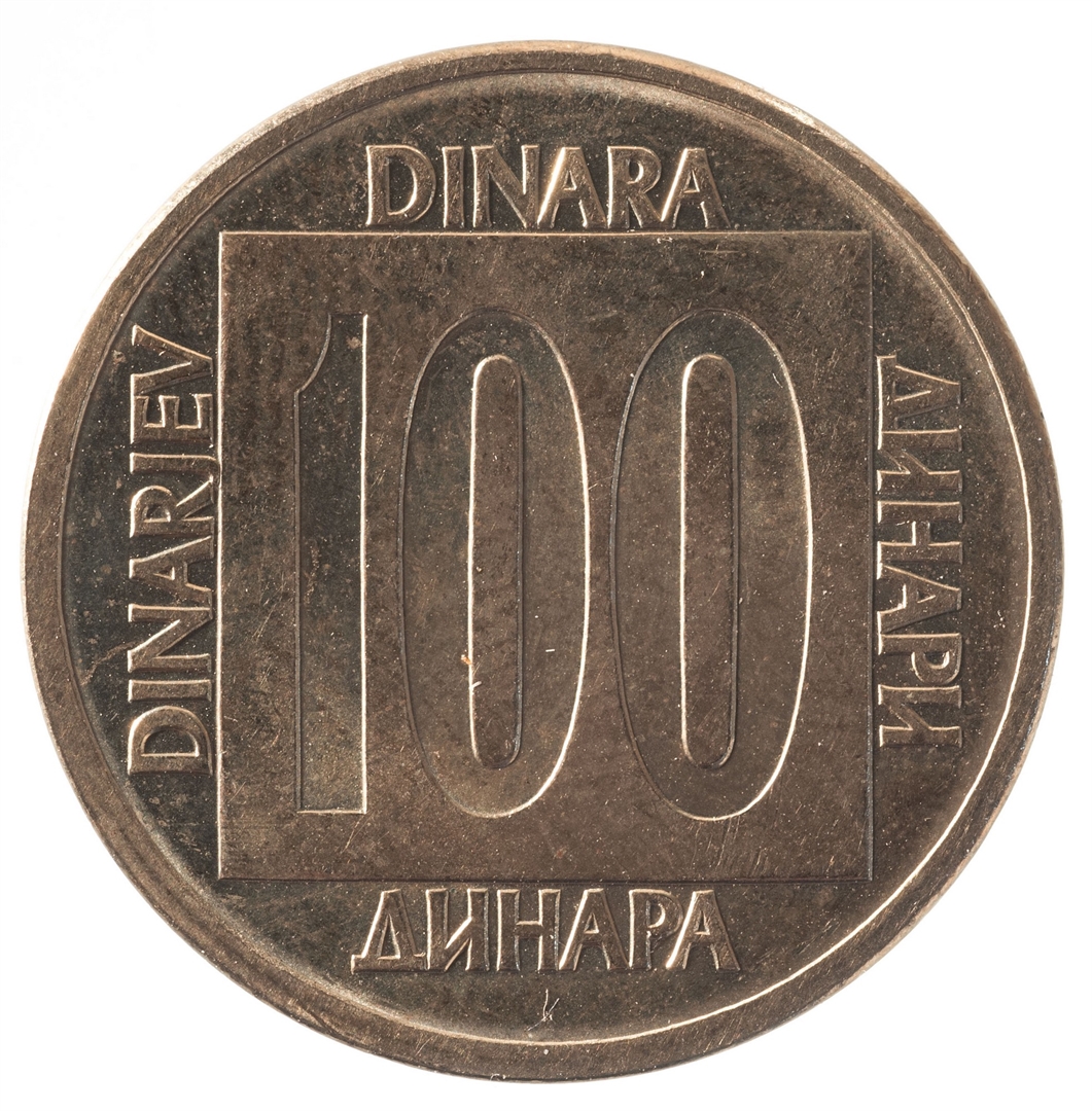U sredini četverokuta broj 100 (nominala), oko njega tekst DINAR na četiri jezika.