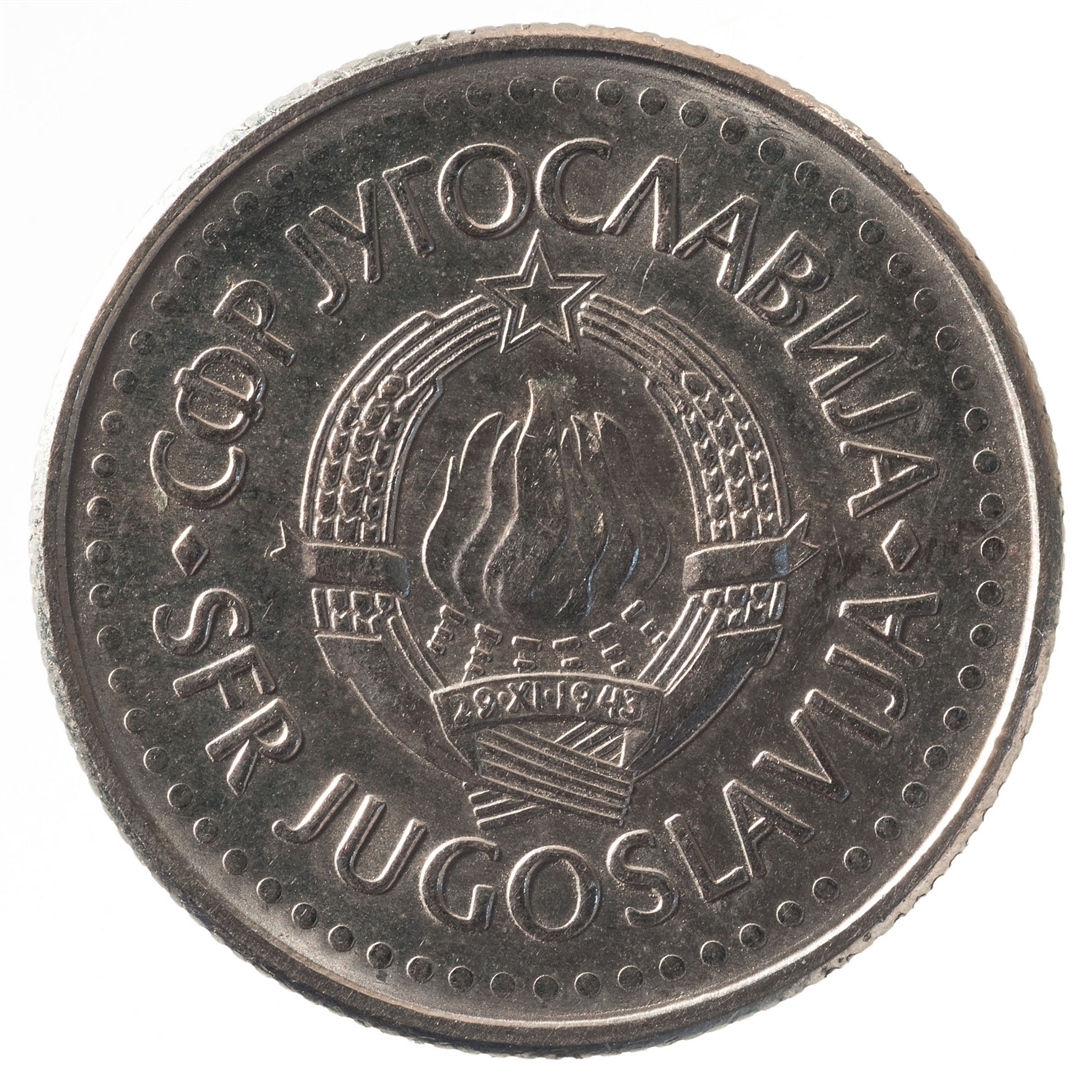 U sredini državni grb. Oko njega uz rub polukružno napisan tekst SFR JUGOSLAVIJA na latinici i ćirilici.