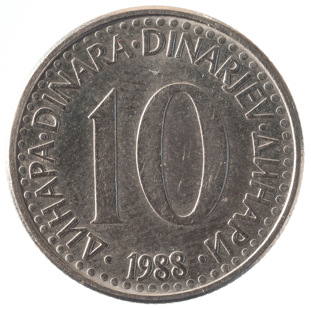 U sredini broj 10 (nominala), oko njega tekst DINAR na četiri jezika, a ispod toga godina 1988.