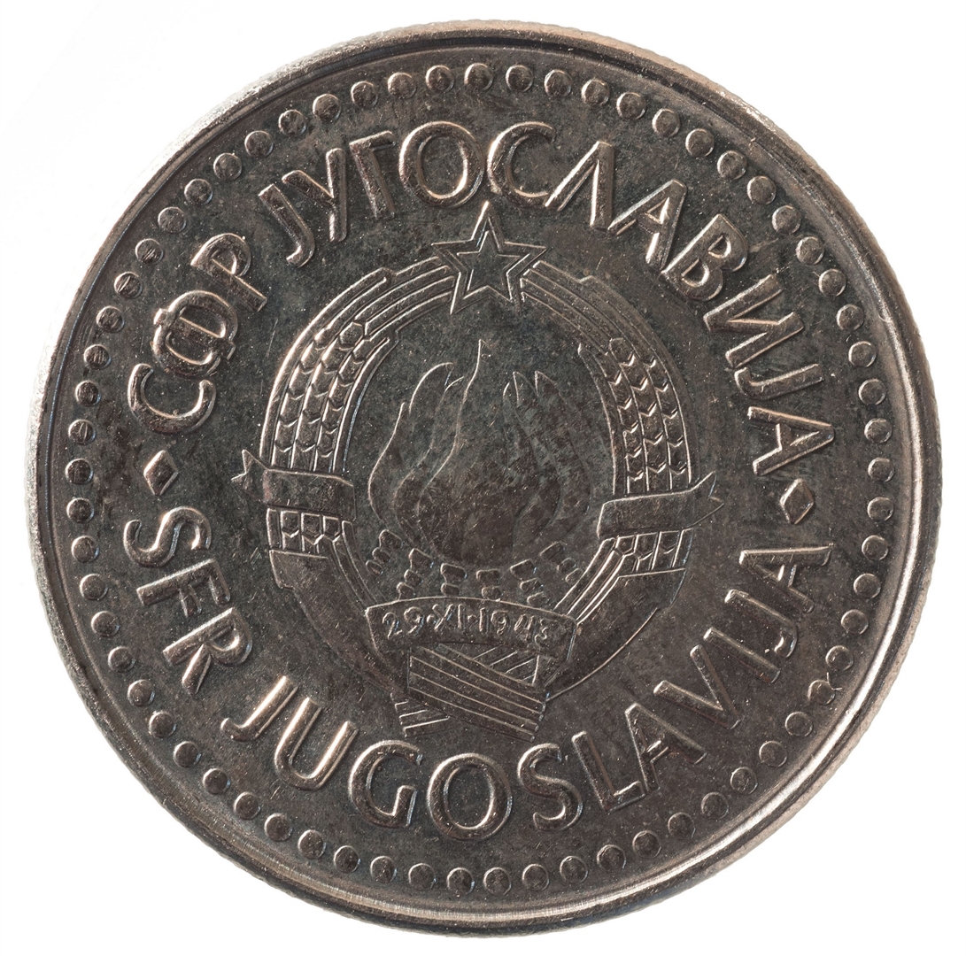 U sredini državni grb. Oko njega uz rub polukružno napisan tekst SFR JUGOSLAVIJA na latinici i ćirilici.
