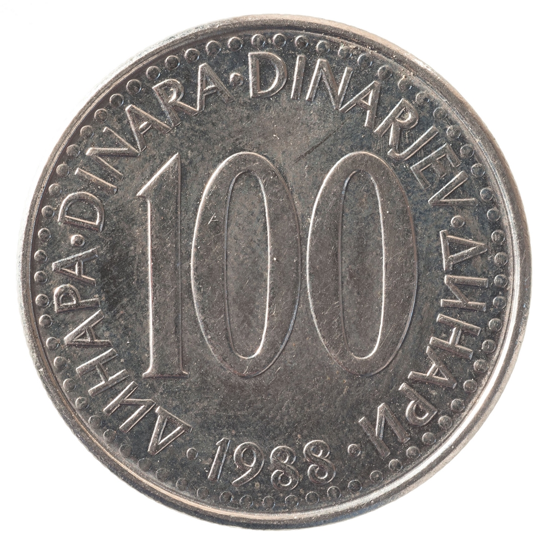 U sredini broj 100 (nominala), oko njega tekst DINAR na četiri jezika, a ispod toga godina 1988.