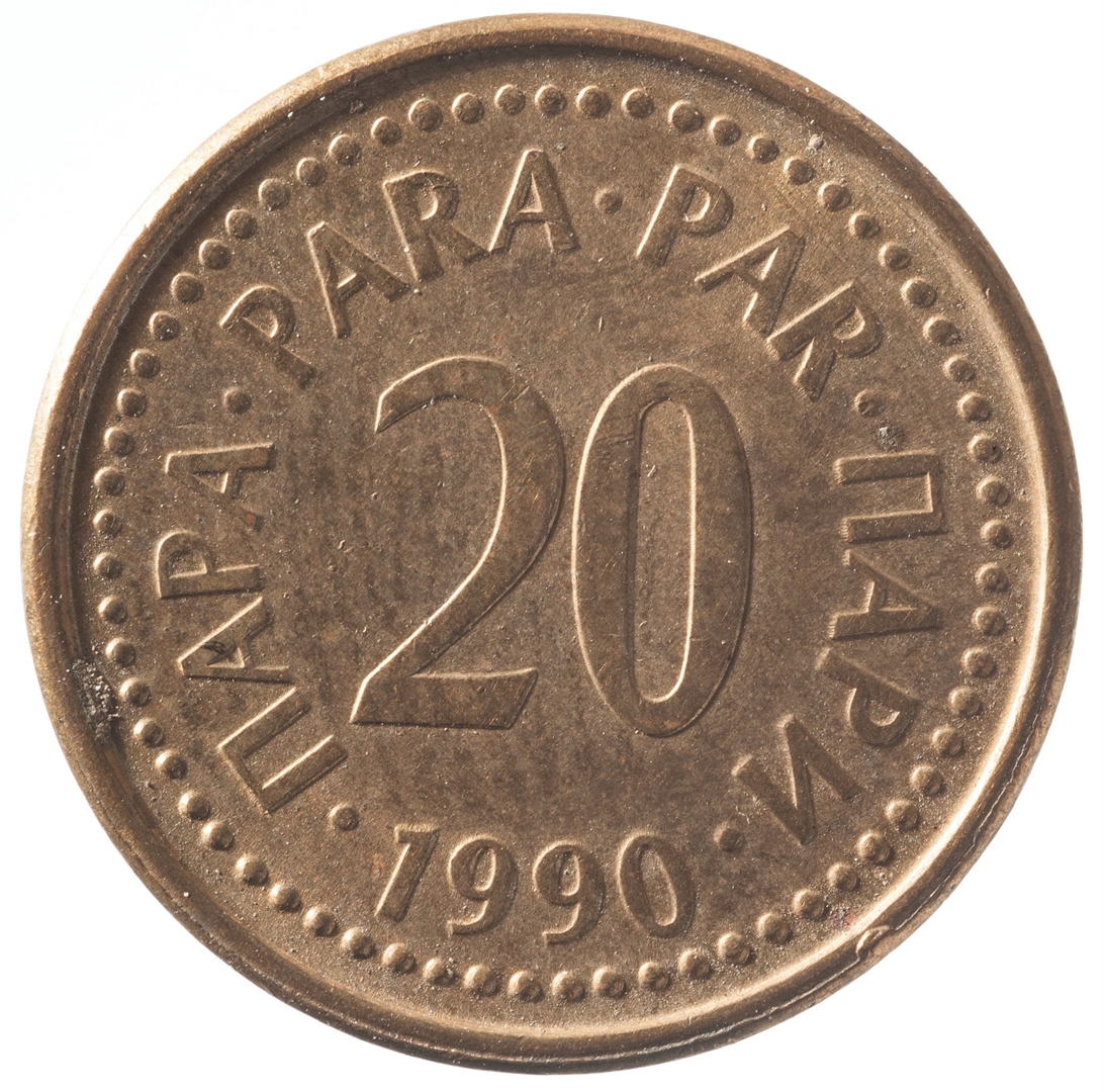 Avers: U sredini državni grb. Oko njega uz rub polukružno napisan tekst SFR JUGOSLAVIJA na latinici i ćirilici. Revers: U sredini broj 20 (nominala), oko njega tekst DINAR na četiri jezika, a ispod toga godina 1990.