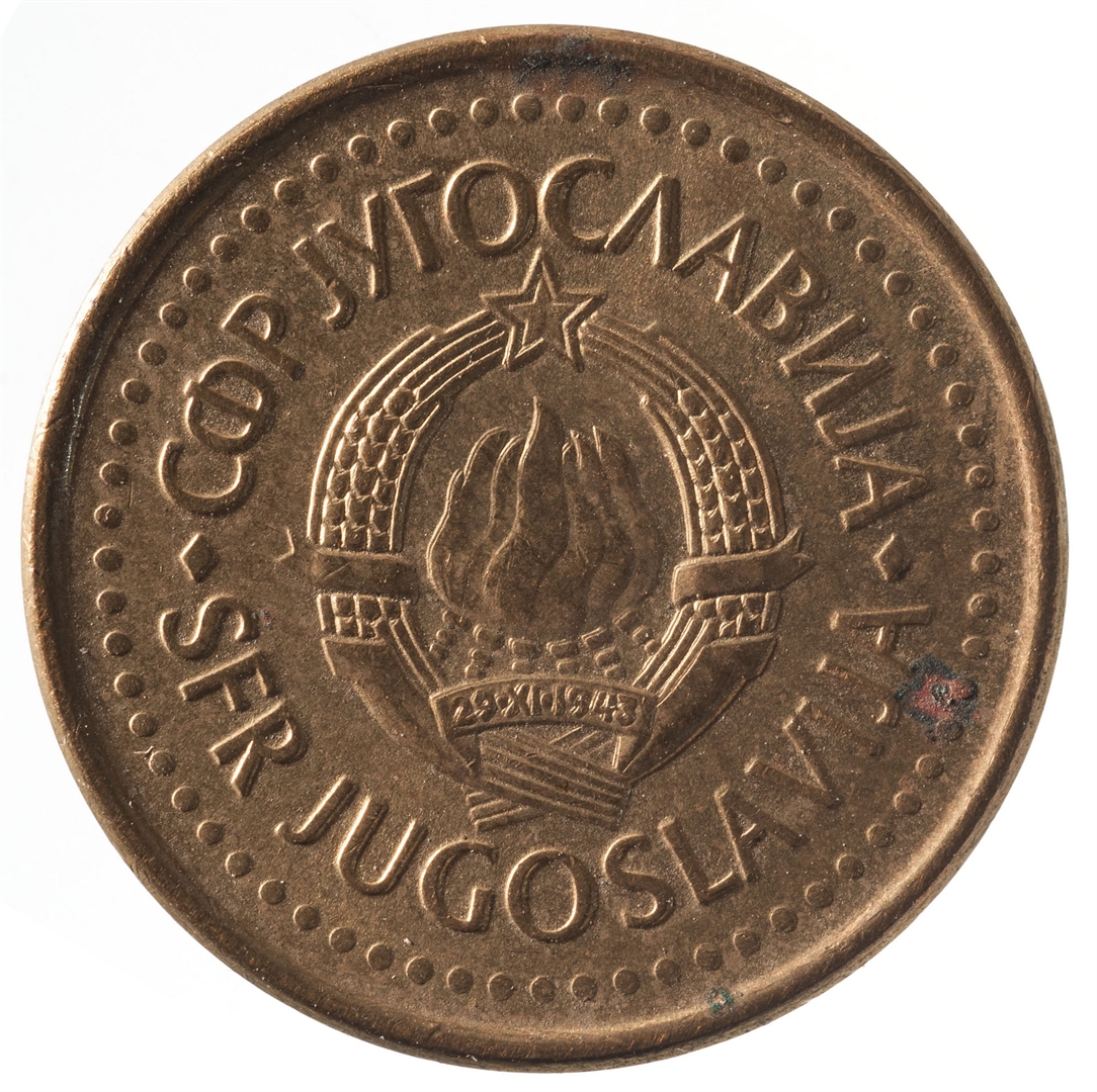 U sredini državni grb. Oko njega uz rub polukružno napisan tekst SFR JUGOSLAVIJA na latinici i ćirilici.