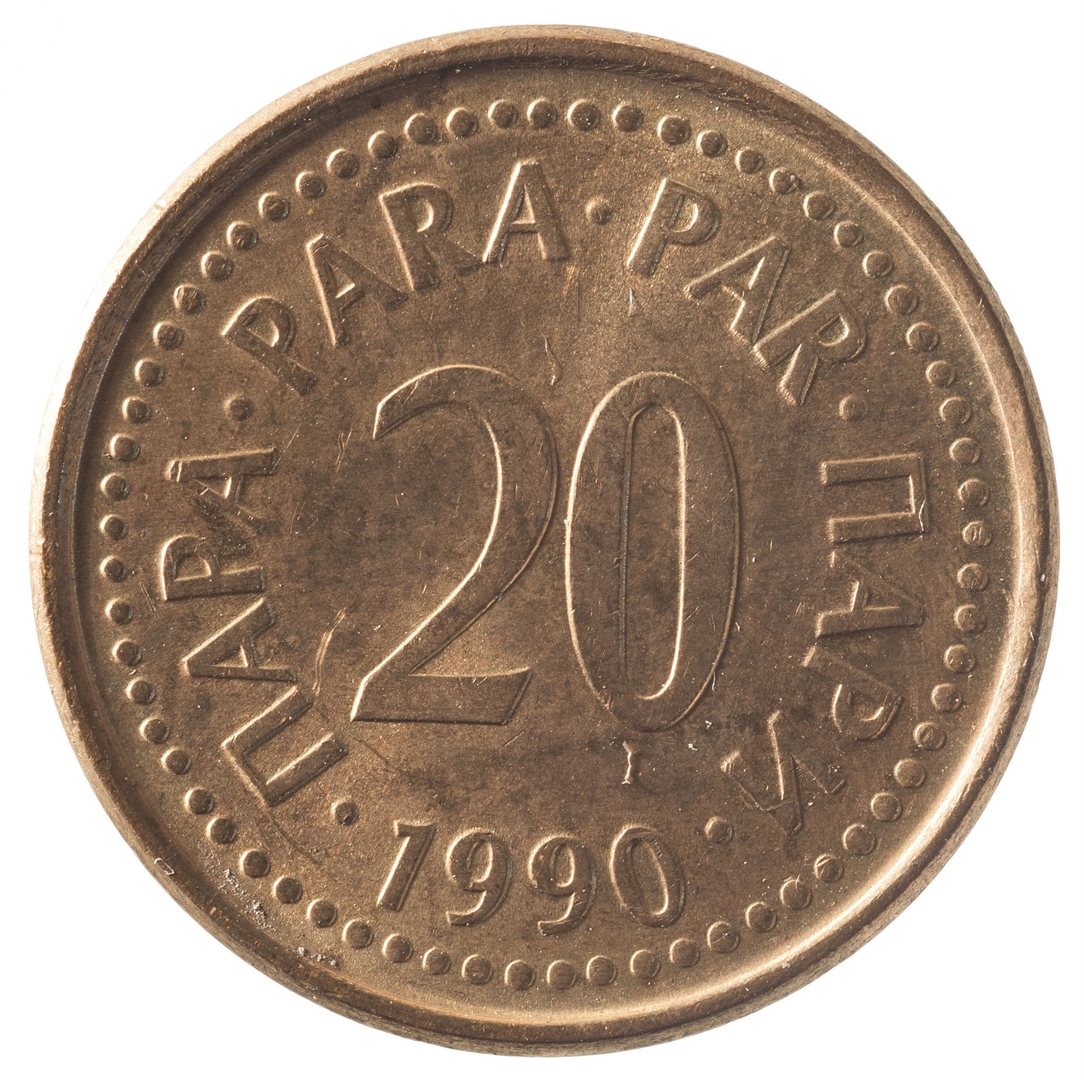 U sredini broj 20 (nominala), oko njega tekst DINAR na četiri jezika, a ispod toga godina 1990.