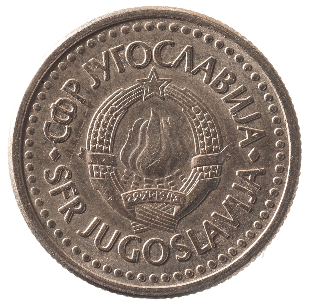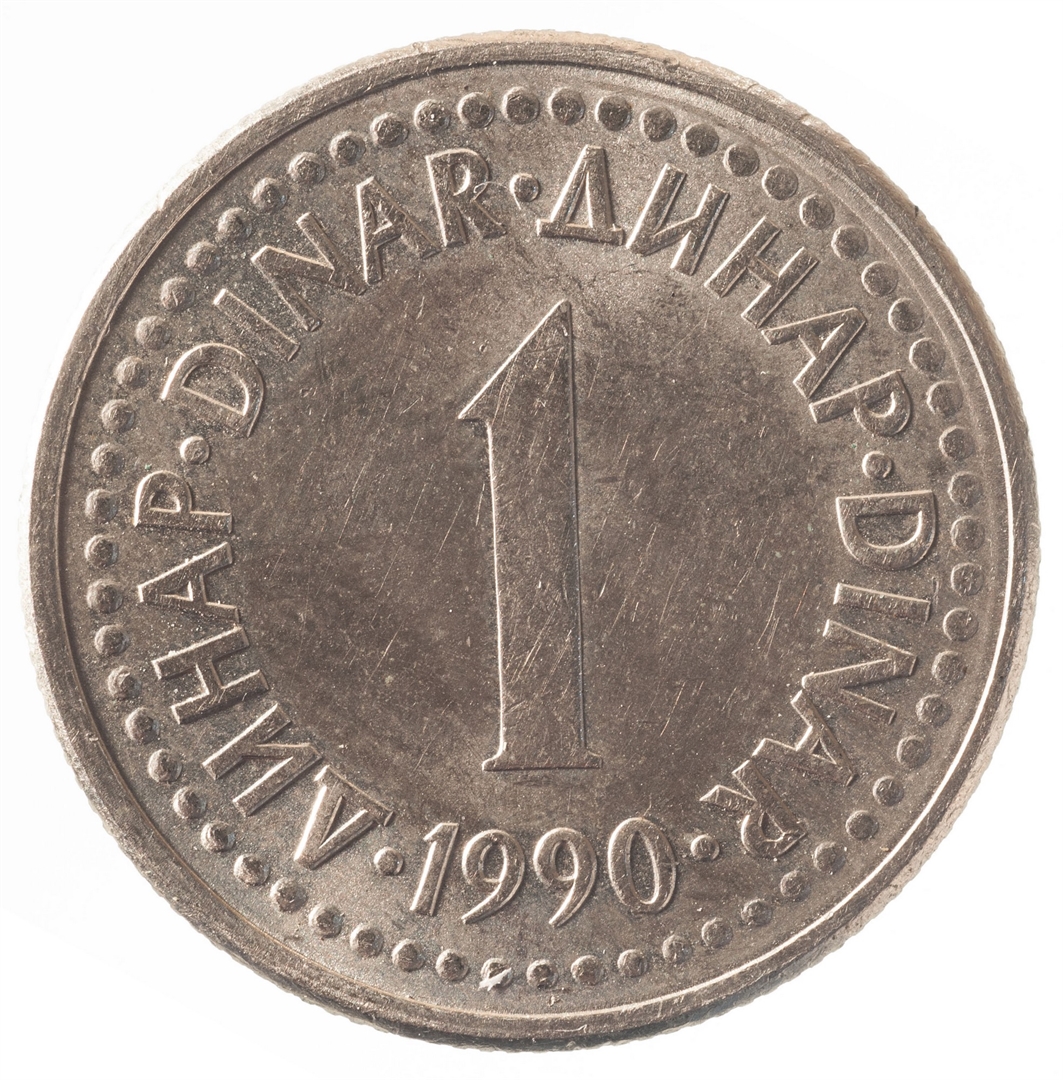 U sredini broj 1 (nominala), oko njega tekst DINAR na četiri jezika, a ispod toga godina 1990.
