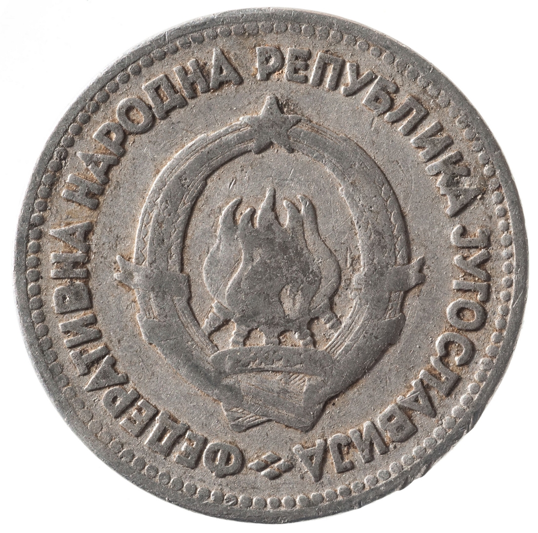 U sredini državni grb. U gornjem djelu uz rub polukružno napisan tekst FEDERATIVNA NARODNA REPUBLIKA JUGOSLAVIJA na ćirilici.