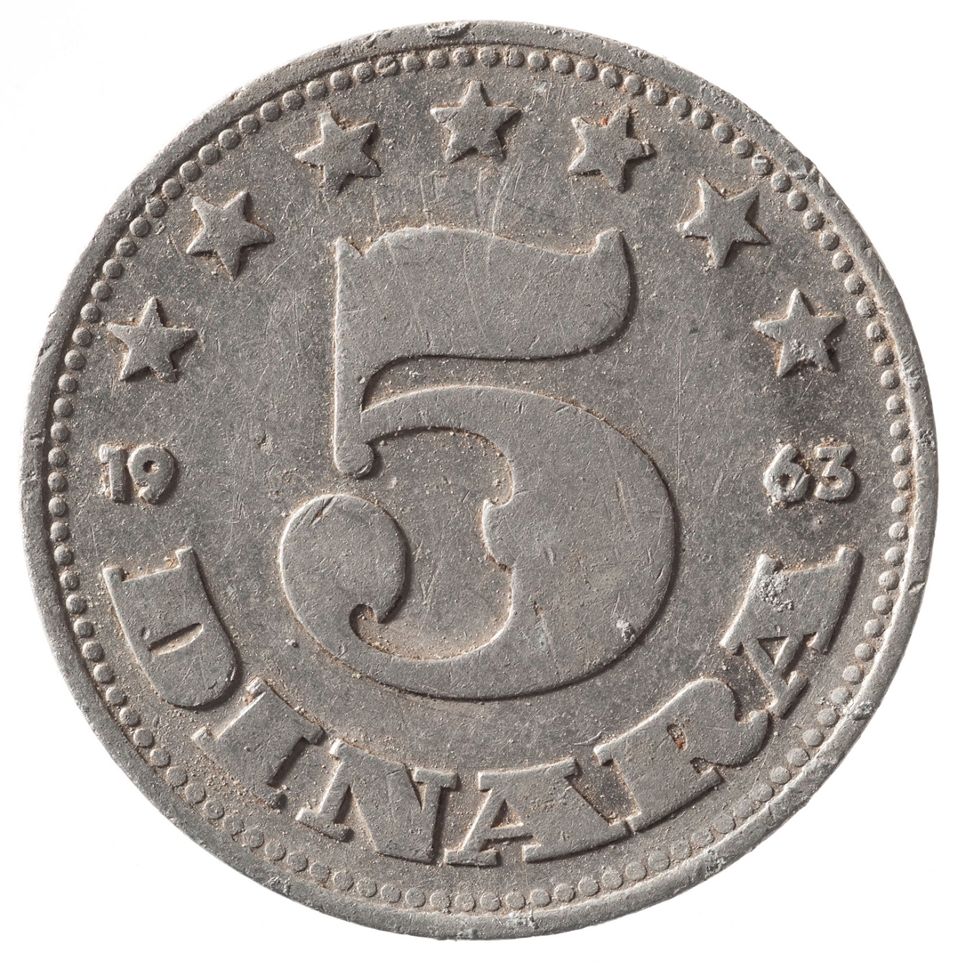 U sredini broj 5 (nominala), a ispod njega tekst DINARA. Duž cijelog gornjeg ruba polukružno poredano 7 petokrakih zvjezdi. U sredini uz lijevi i desni rub upisana godina 1963.