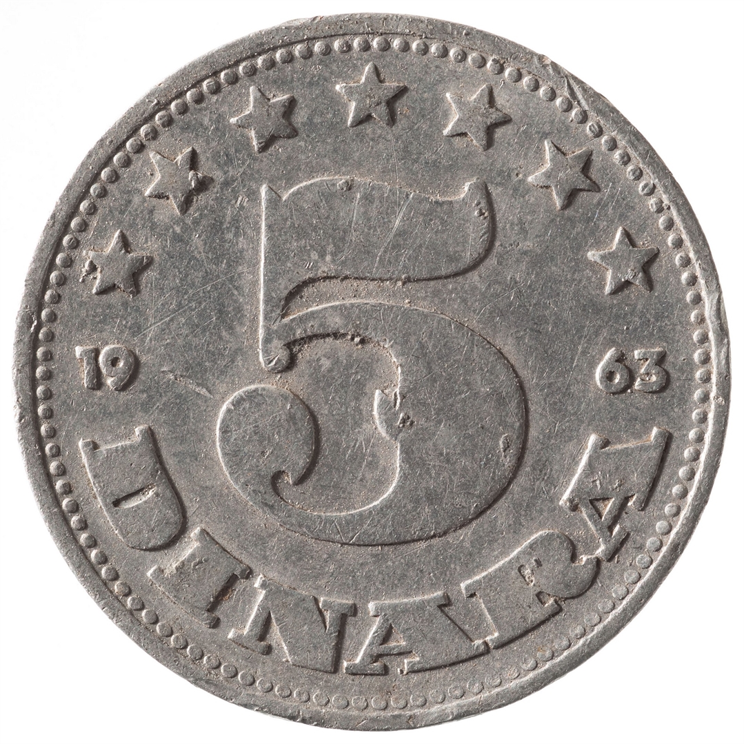 Avers: U sredini državni grb. U gornjem djelu uz rub polukružno napisan tekst SOCIJALISTIČKA FEDERATIVNA REPUBLIKA JUGOSLAVIJA na ćirilici. Revers: U sredini broj 5 (nominala), a ispod njega tekst DINARA. Duž cijelog gornjeg ruba polukružno poredano 7 petokrakih zvjezdi. U sredini uz lijevi i desni rub upisana godina 1963.